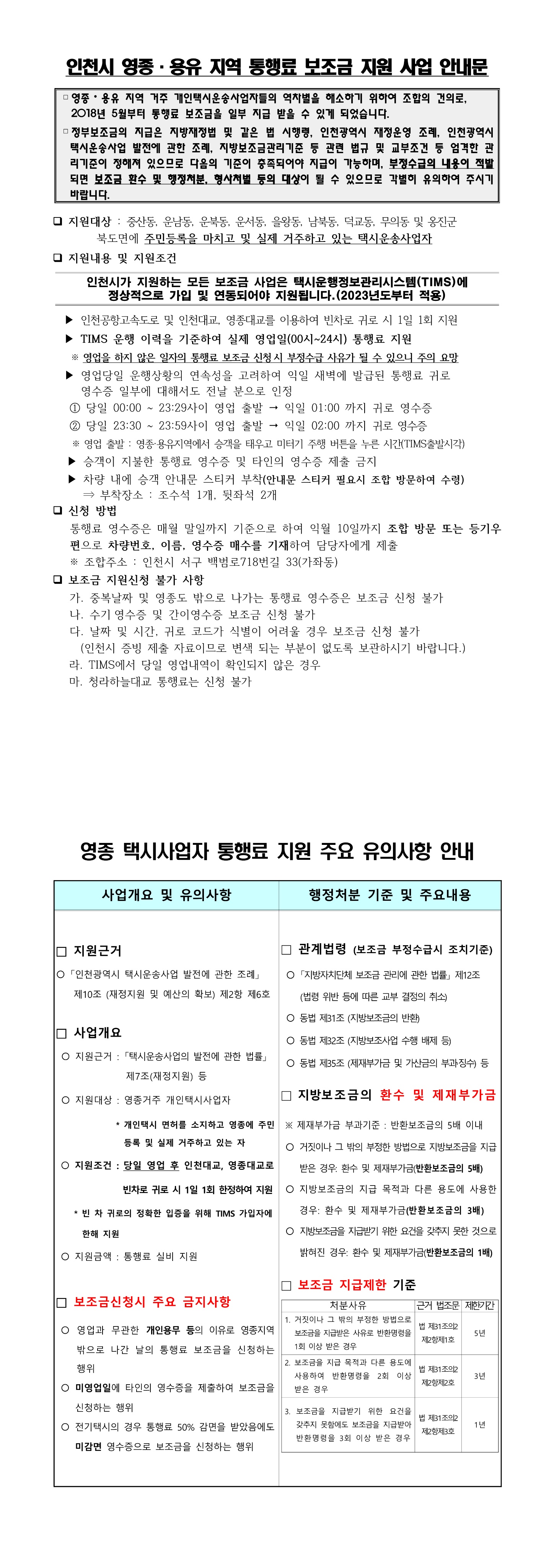 제목 : 인천시 영종 용유지역 통행료 보조금 지원 사업 안내문 및 지원기준 개선사항