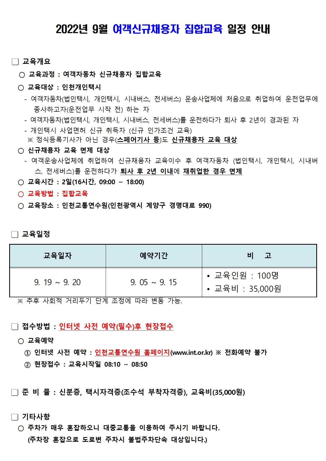 제목 : 2022년 9월 여객운수종사자 신규채용자 집합교육 안내