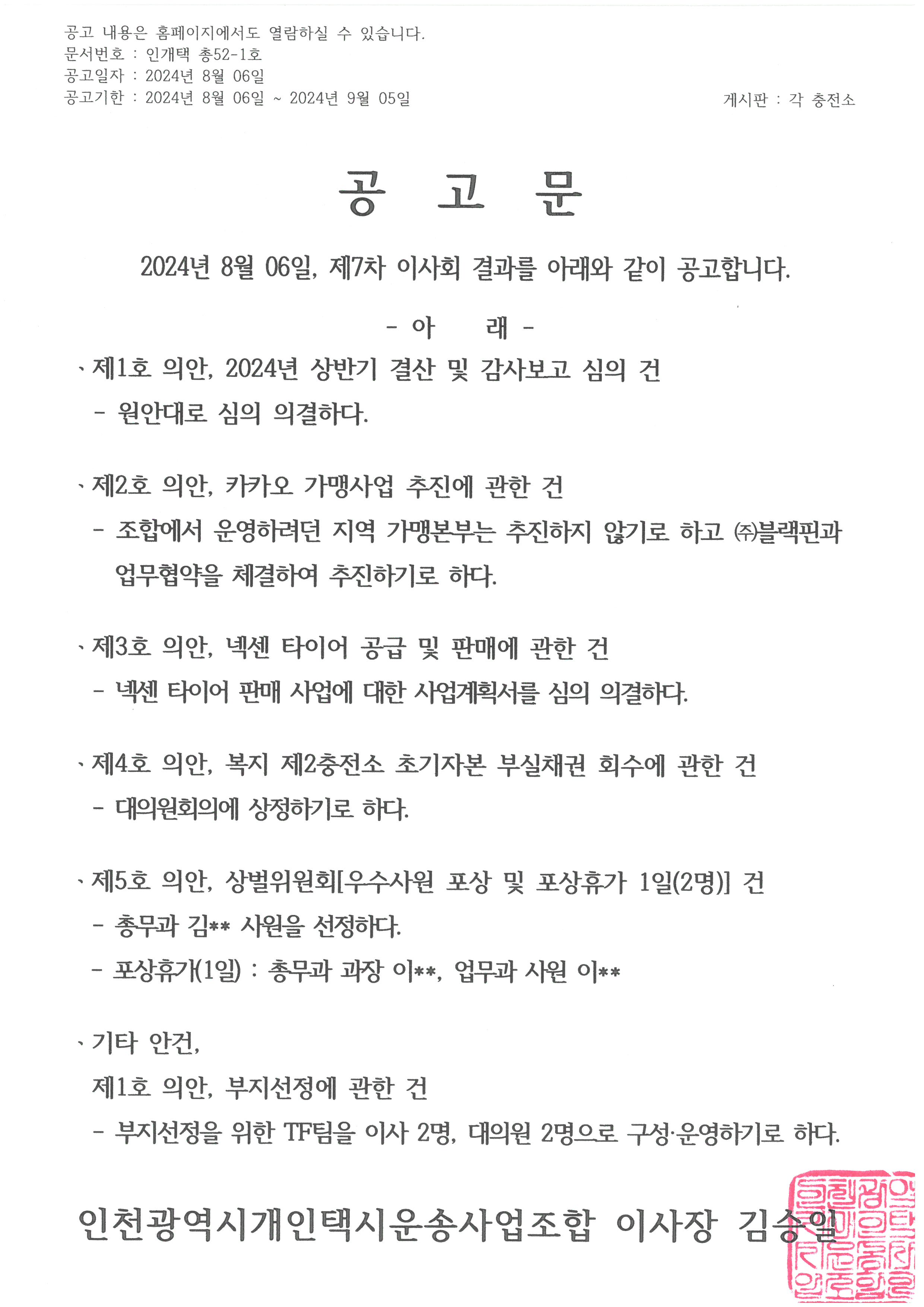 제목 : 2024년도 제7차 이사회 결과 공고