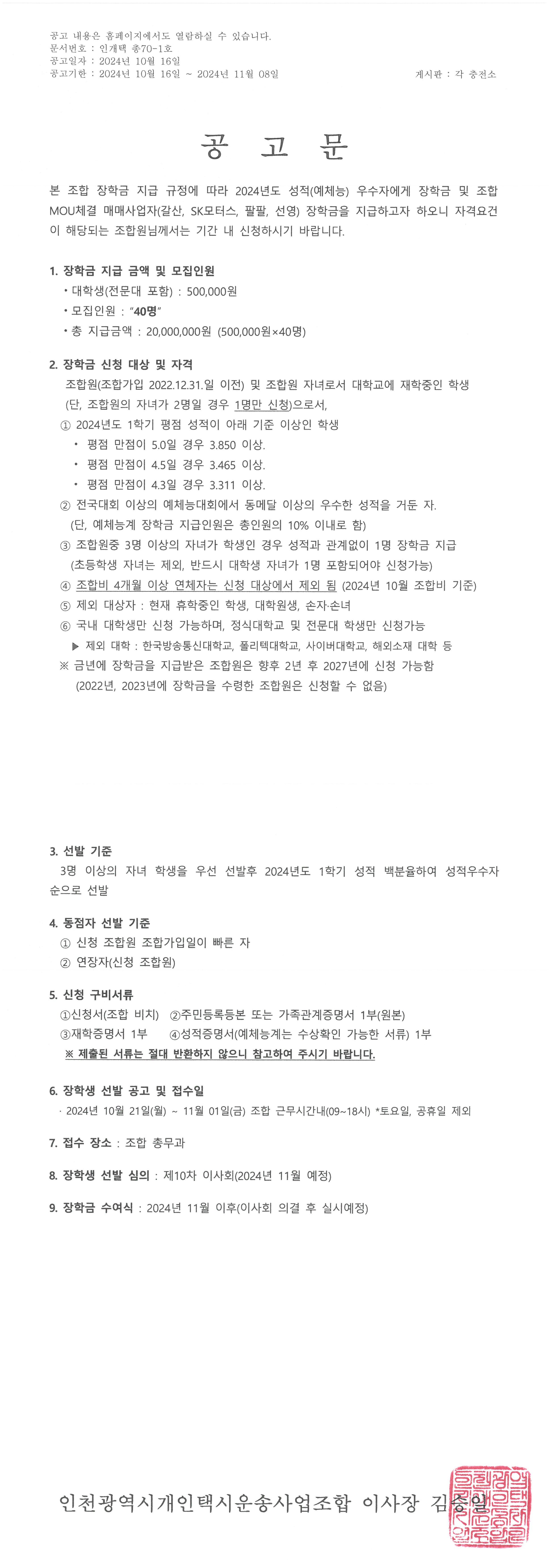 제목 : 2024년도 조합 MOU체결 매매사업자 성적우수 장학금 선발자 공고문