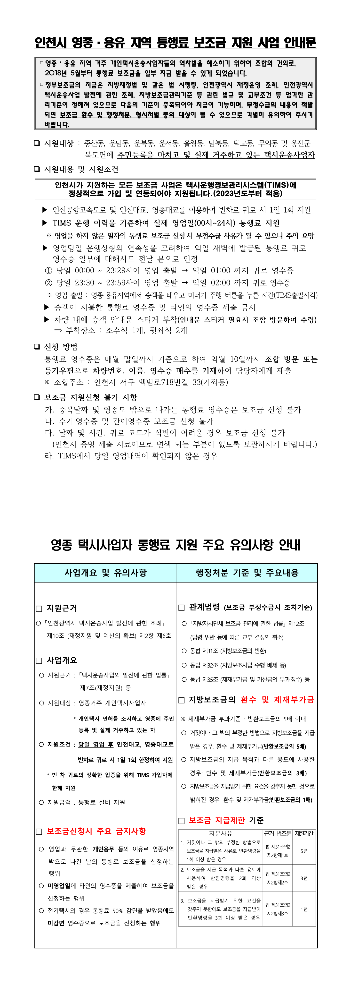 제목 : 인천시 영종 용유지역 통행료 보조금 지원 사업 안내문 및 지원기준 개선사항