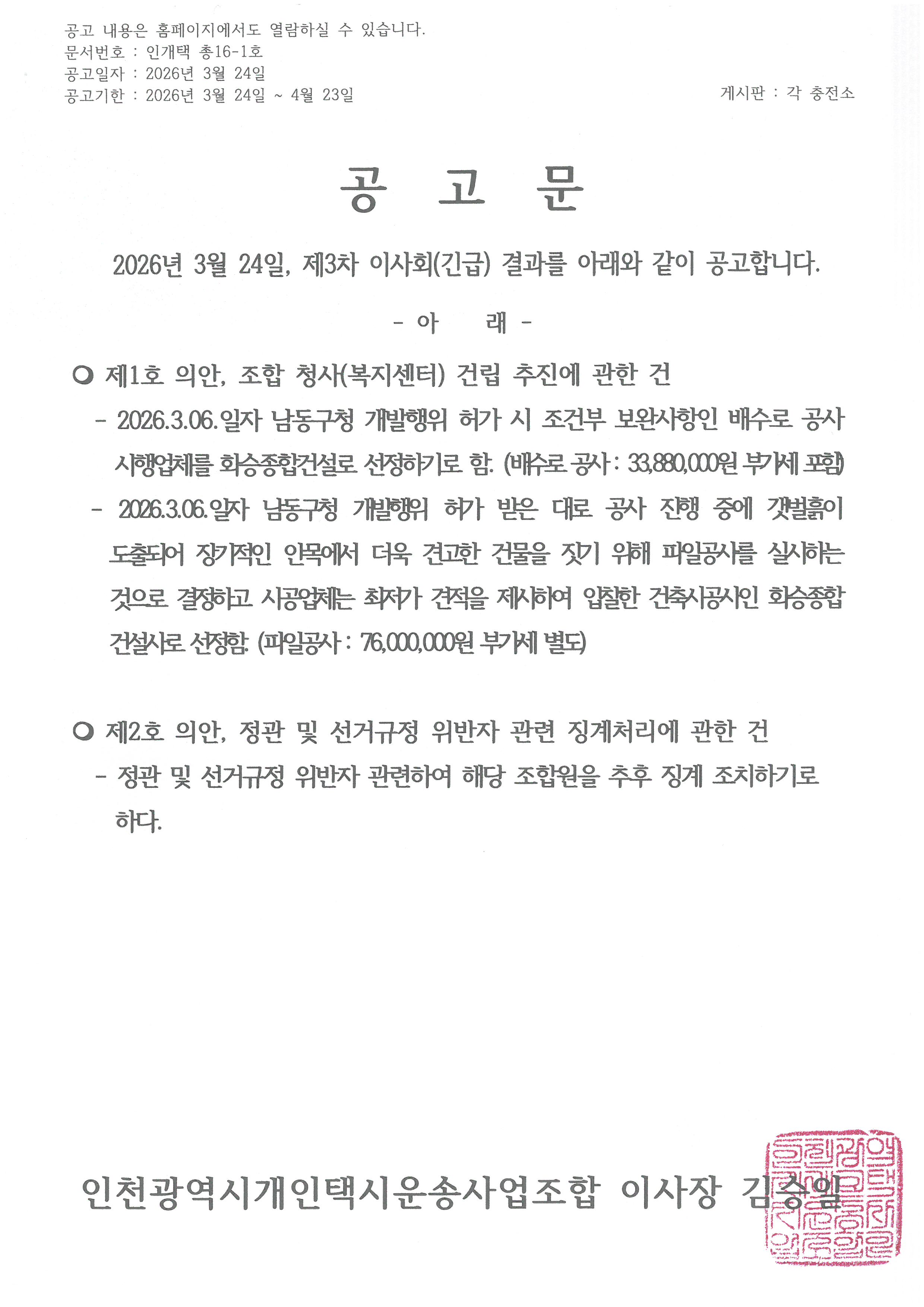 제목 : 2026년 제3차 이사회(긴급) 결과 공고